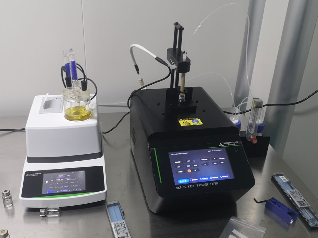正合医疗购买的是维科美拓WKT-A9“精湛型”卡尔费休水分测定仪和配套的辅助加热设备WKT-V2型卡式加热炉。WKT-A9“精湛型”卡尔费休水分测定仪采用卡尔费休库仑法原理测定样品中水分含量,可快速测定液体、固体、气体中的水分含量,广泛应用在化工、医药、塑料、食品、锂电、检测、石油、电力、农药行业及院校科研等领域。对于不能直接加入电解池的样品,采用气相萃取法是一个完美的解决方案,在此过程中,将样品置于样品舟/样品瓶中,移入WKT-V2型卡式加热炉的加热炉中,加热样品至特定温度(最高300˚C),通过干燥的空气或者氮气将水分萃取并转移至滴定杯中,再通过卡尔费休测定仪测出样品水分浓度值。
