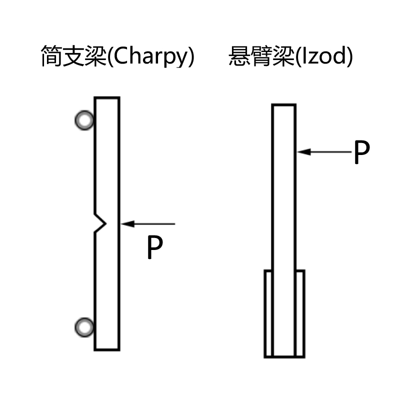简支梁冲击强度与悬臂梁冲击强度表示的是材料单位面积内吸收的能量,吸收的越多,就表示材料抗冲能力越好。如右图所示,是两种冲击的示意图。