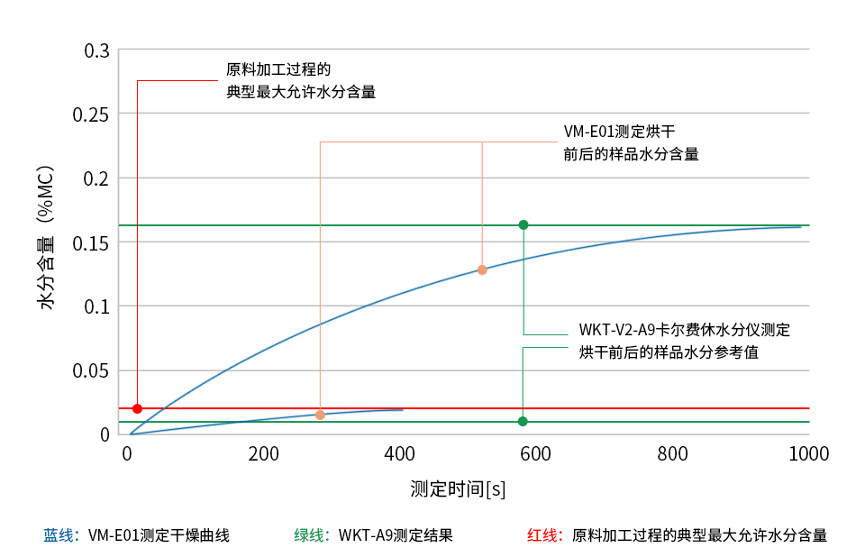 绿线:WKT-A9卡尔费休水分仪和配套WKT-V2卡式加热炉配合使用测定的水分含量(平均值)。